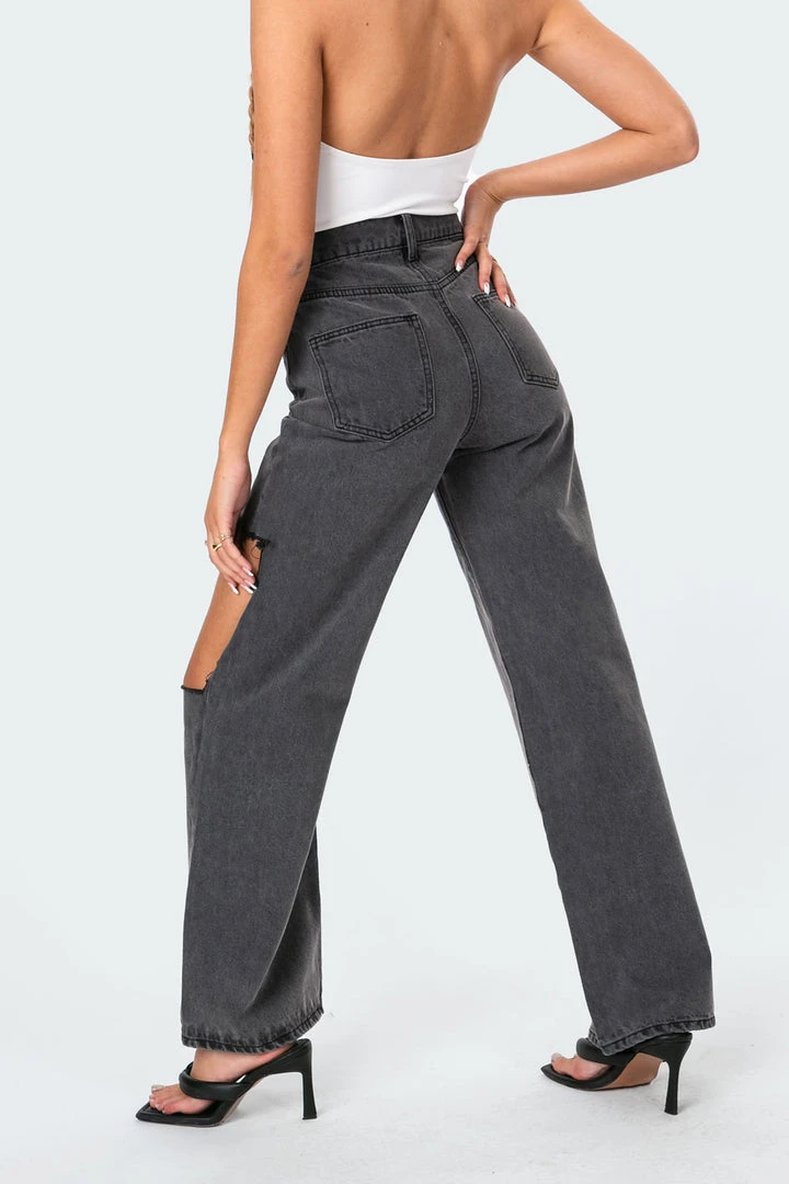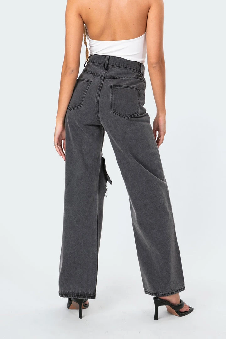 These super wide-leg jeans are the perfect vintage gray wash with a large ripped knee detail for that cool girl grunge look.