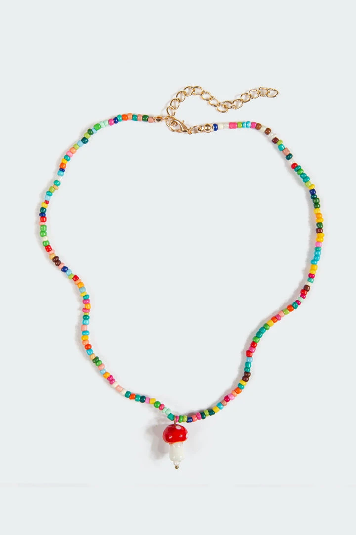 This mushroom pendant beaded necklace is the perfect way to add some color to any outfit.
