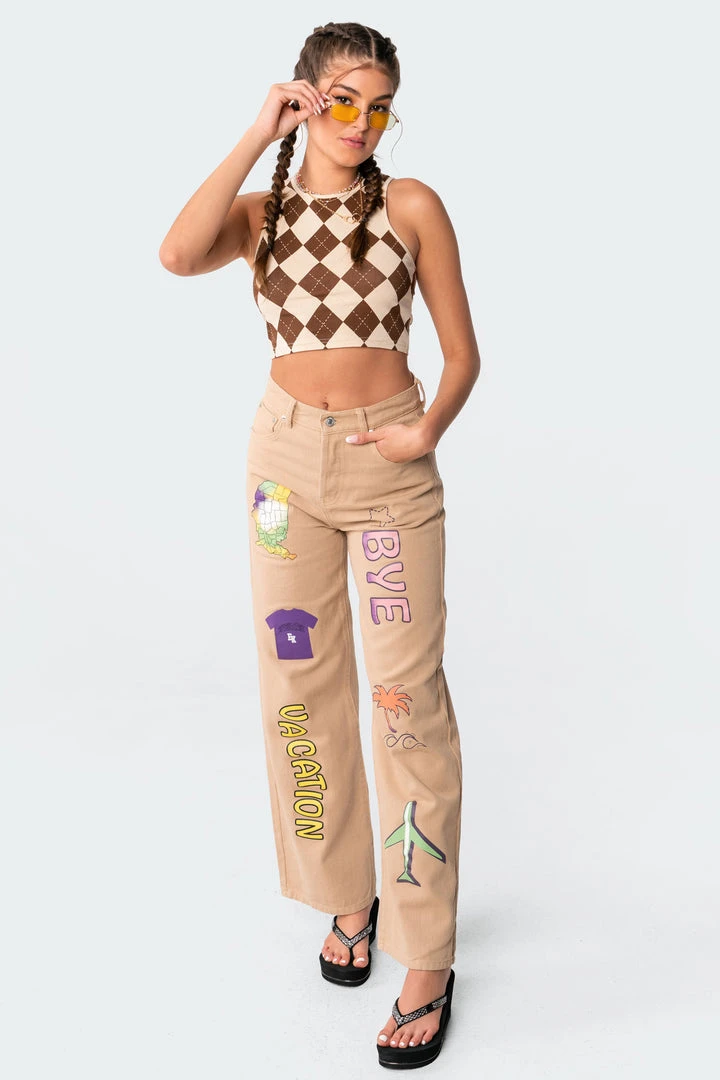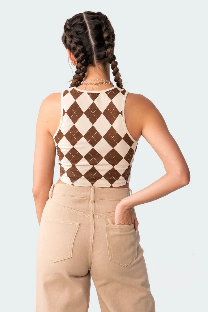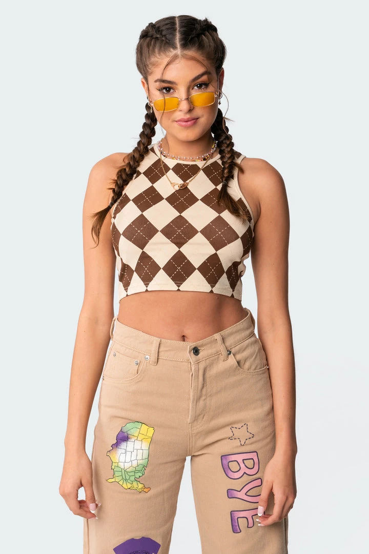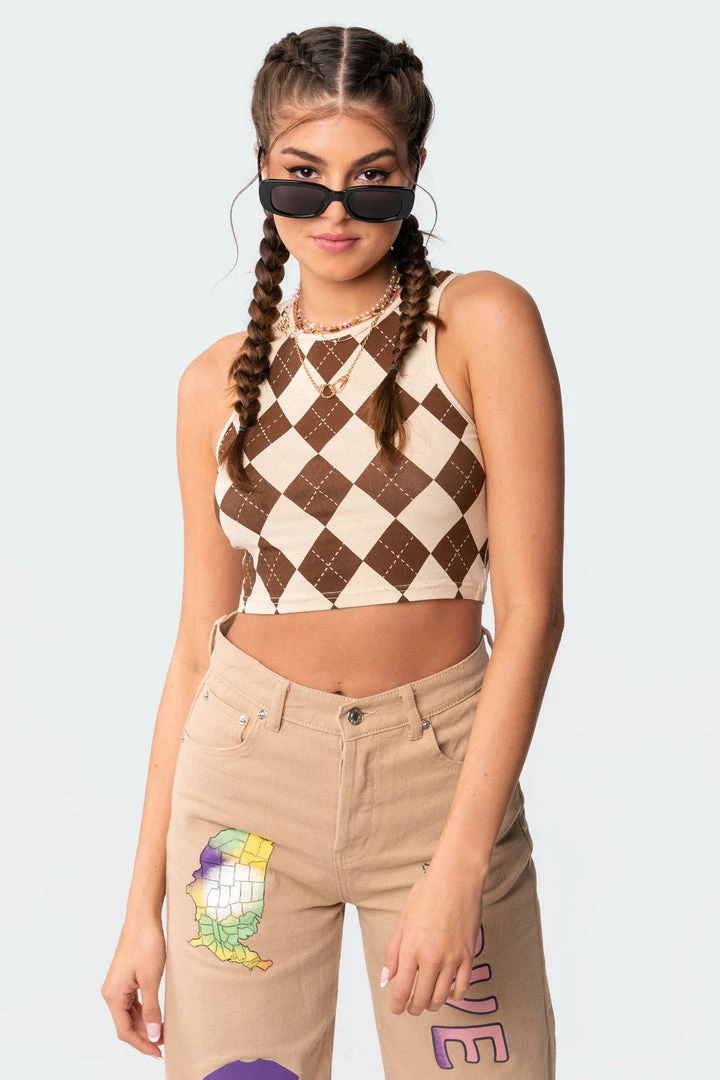 This trendy crop top is made from a stretchy lightweight fabric and has a super stylish argyle print throughout.