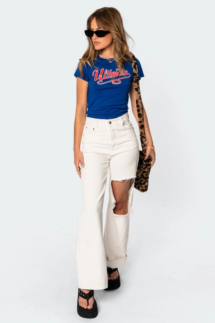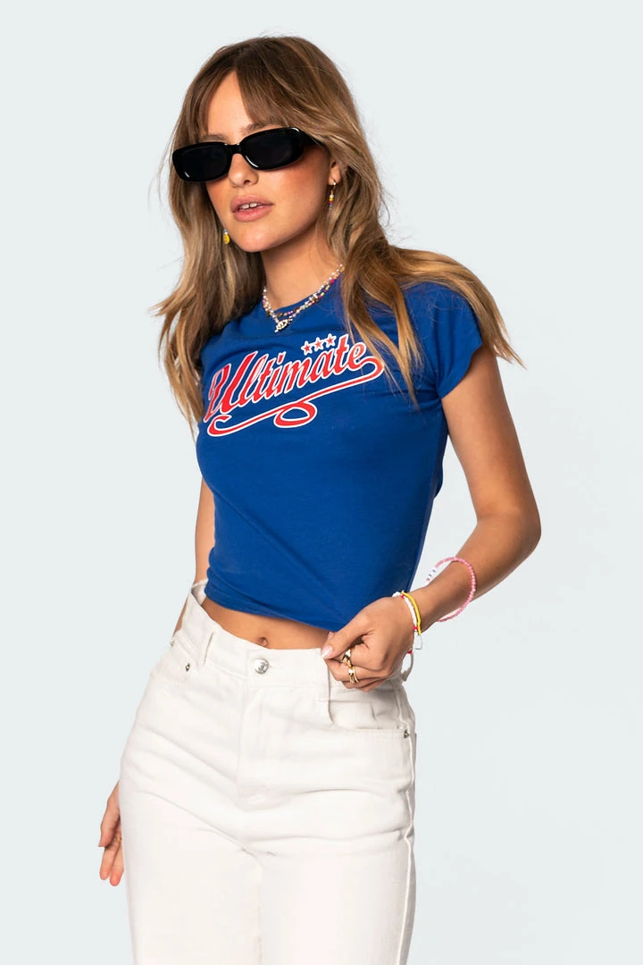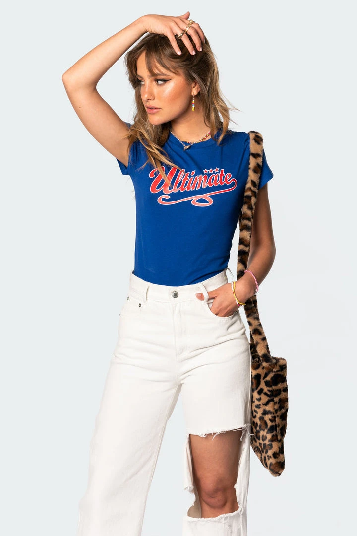 This classic college track t-shirt is made from a soft, stretchy fabric and has an ultimate slogan print on its front.