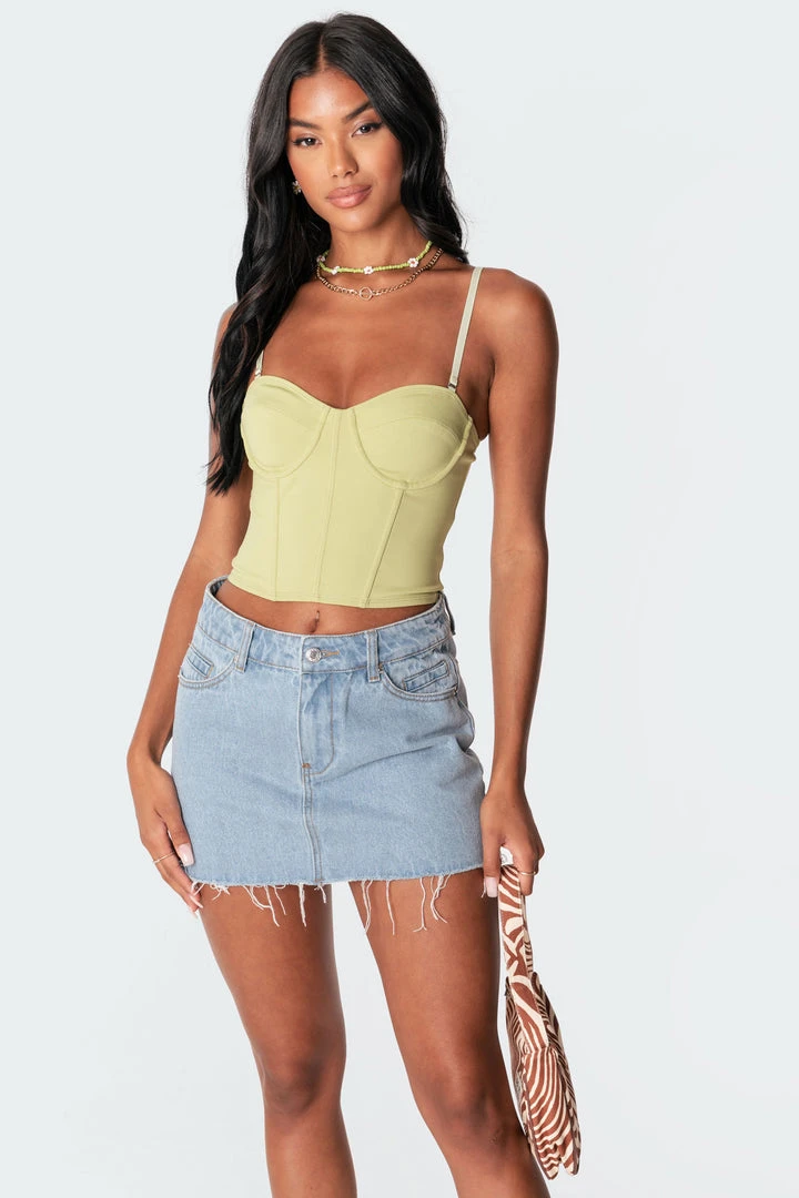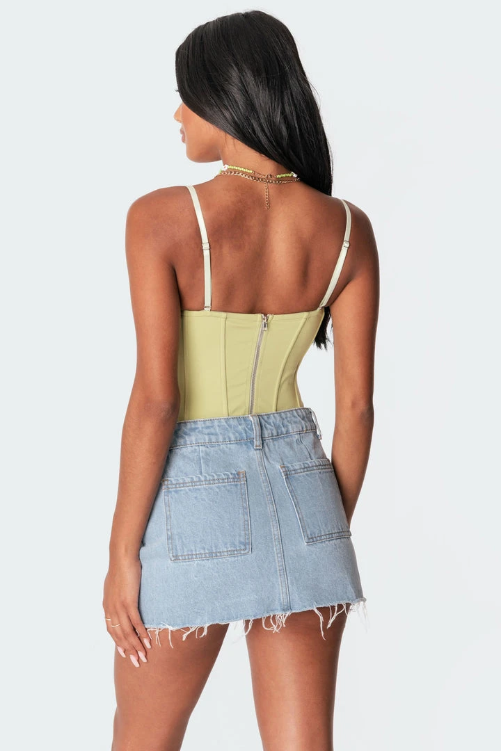 This stunning corset top is made from a smooth fabric with two adjustable straps, a back zip closure, and has a classic boned bodice design.
