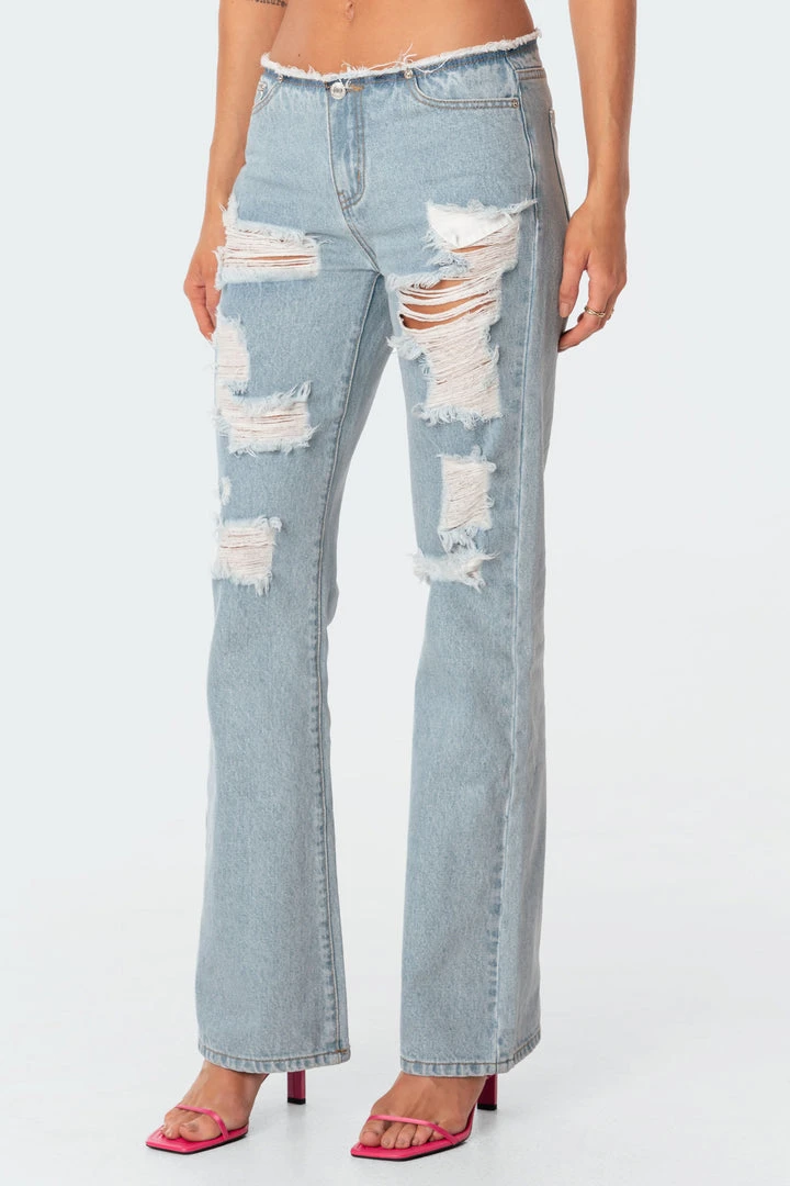 These jeans are made from durable denim fabric, with a raw edge waistband and distress detailing throughout.