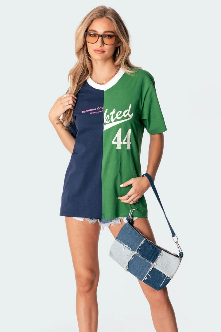 This shirt made from a soft, lightweight fabric, has a ribbed neckline, and features a split printed graphic on its front.