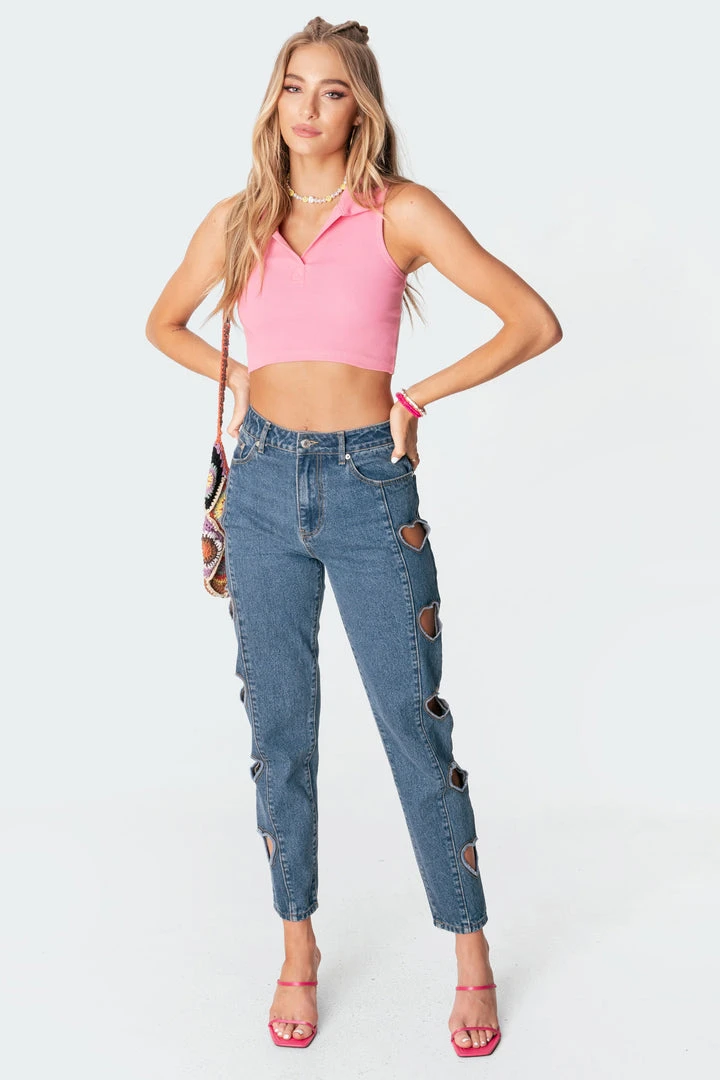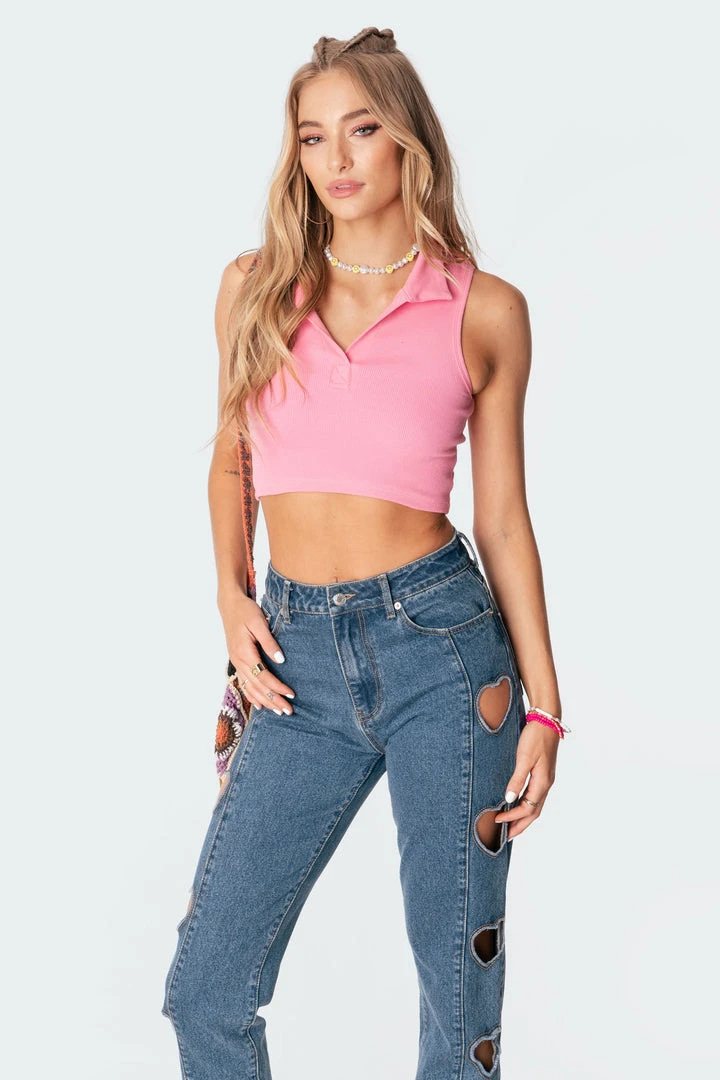 This crop top is made from a ribbed breathable fabric with a cute open rugby collar to finish for the perfect Y2K vibe.