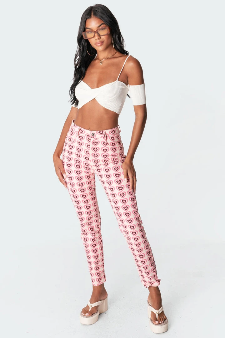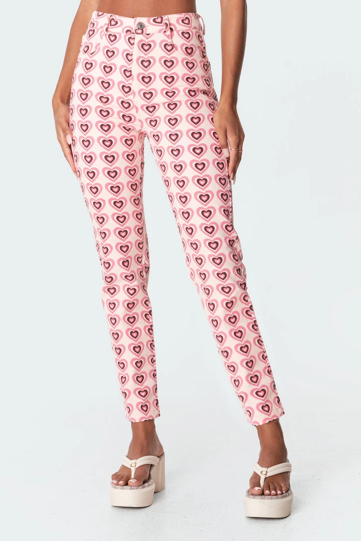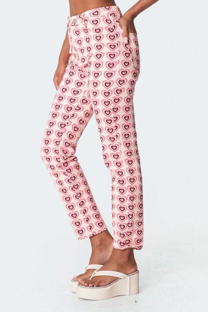 Feel romantic in these pink and brown heart-printed mom jeans. These jeans are made from durable denim fabric with a zip front closure.