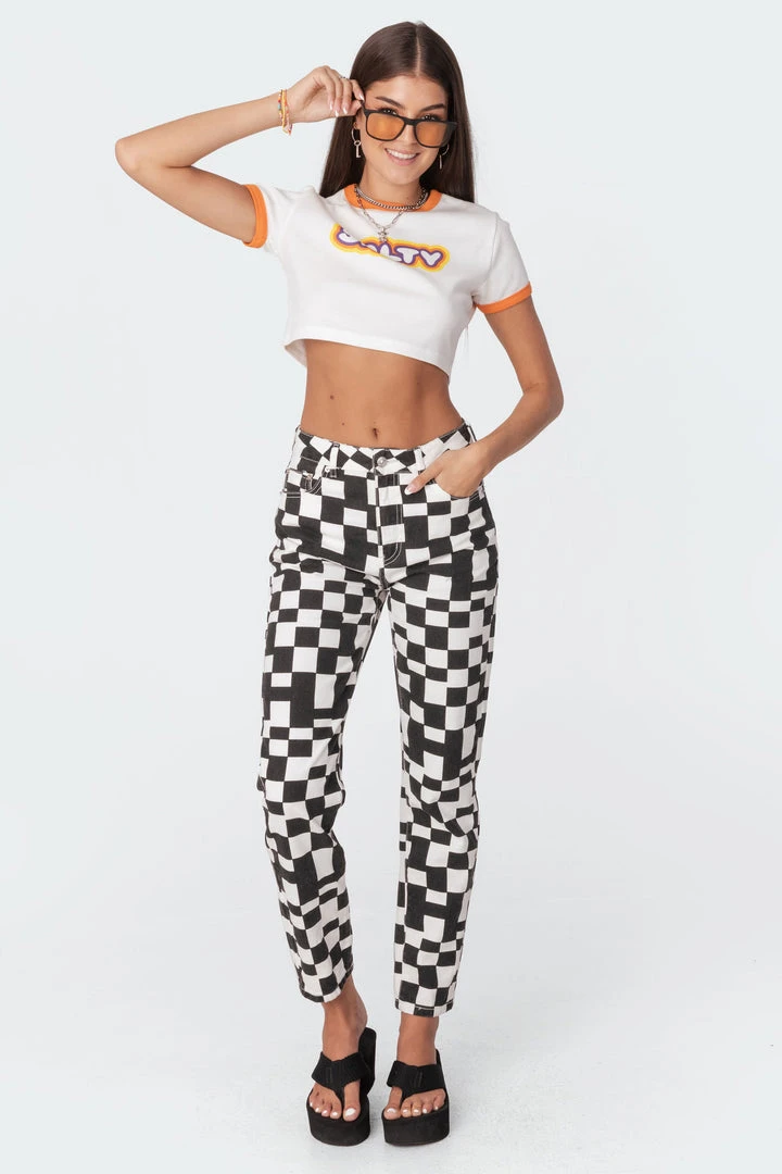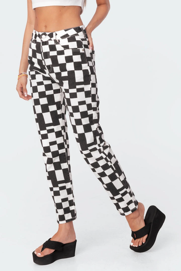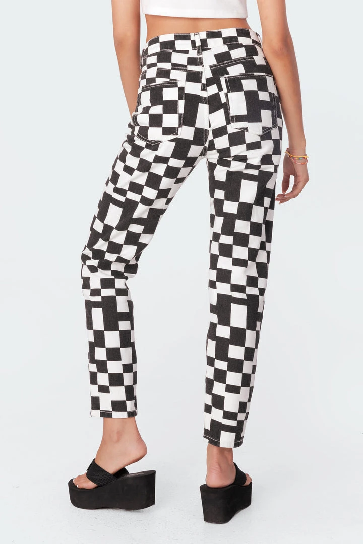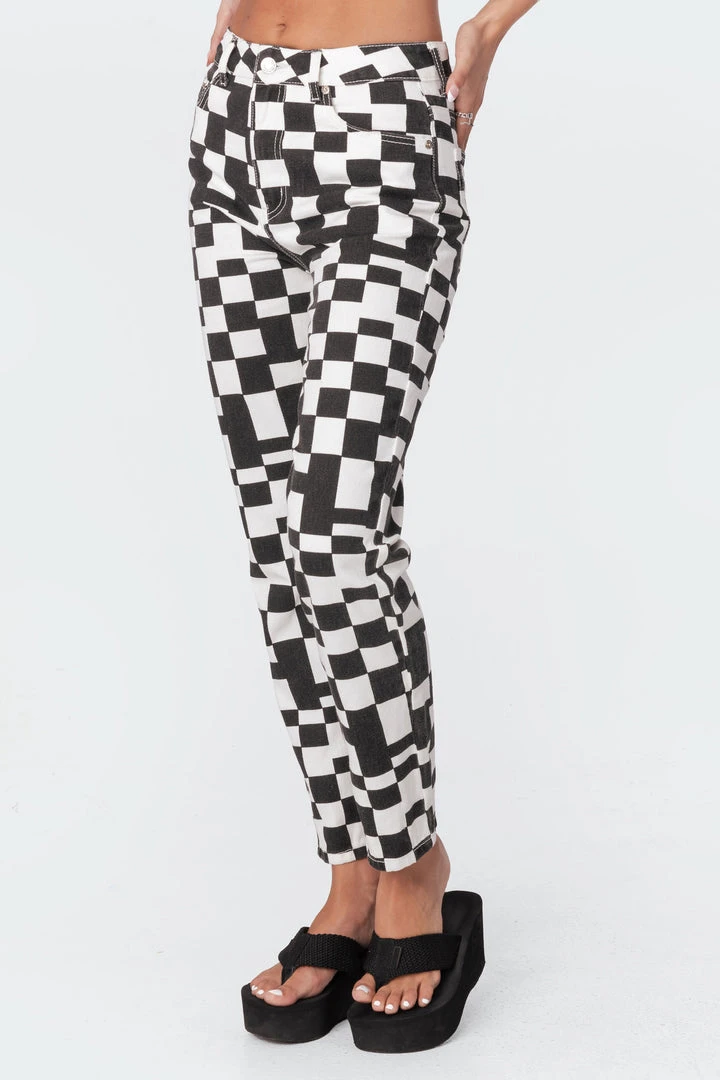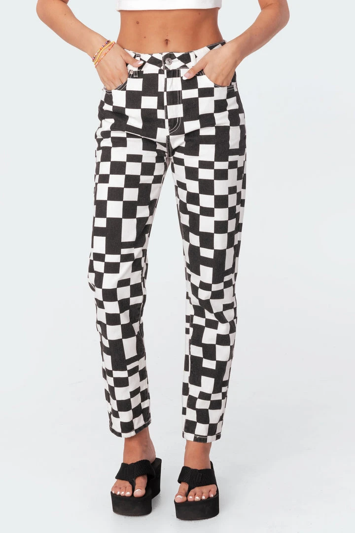 These printed jeans are made from durable denim fabric and have a trendy checkerboard-inspired print throughout.